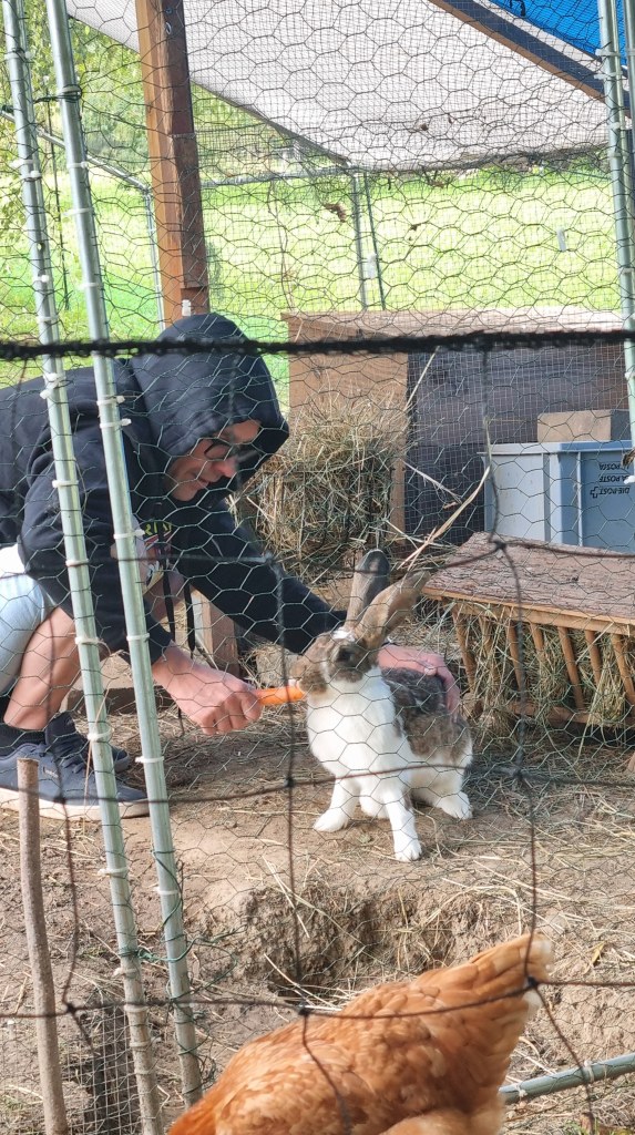 Am Nachmittag gingen wir mit meinem Halbbruder, der seit Weihnachten ebenfalls dort lebt, kurz einkaufen. Ich habe mir Baileys gegönnt – die Grundlage für meine geplanten Baileys-Pralinen. Gegen Abend gab es Apéro inmitten von Hasen und Hühnern. Zum Znacht kochte ich Spaghetti Bolognese mit Salat, bevor wir es uns am Kaminfeuer gemütlich machten – draussen regnete es.