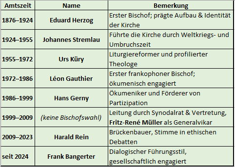 Kein amtierender Bischof Nach dem Rücktritt von Hans Gerny im Jahr 1999 entschied die Nationalsynode, vorerst keinen neuen Bischof zu wählen. Die Leitung der Kirche wurde interimistisch durch ein Team aus Synodalrat, Synodalvertretung und Kirchenkanzlei übernommen. Diese Zeit war geprägt von Reflexion, Strukturfragen und einer Neuorientierung der kirchlichen Leitung – insbesondere im Hinblick auf die Stellung des Bischofsamts in einer demokratisch verfassten Kirche.
